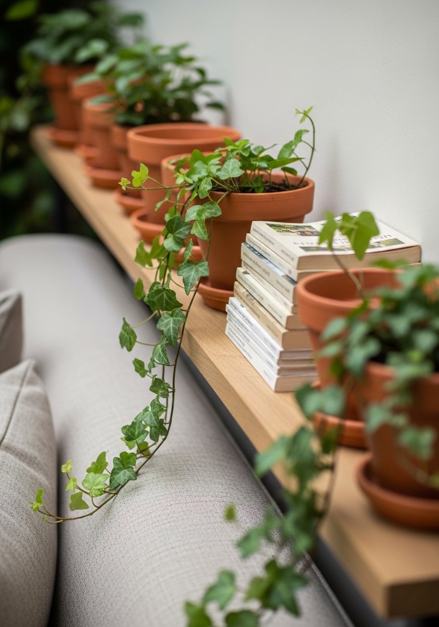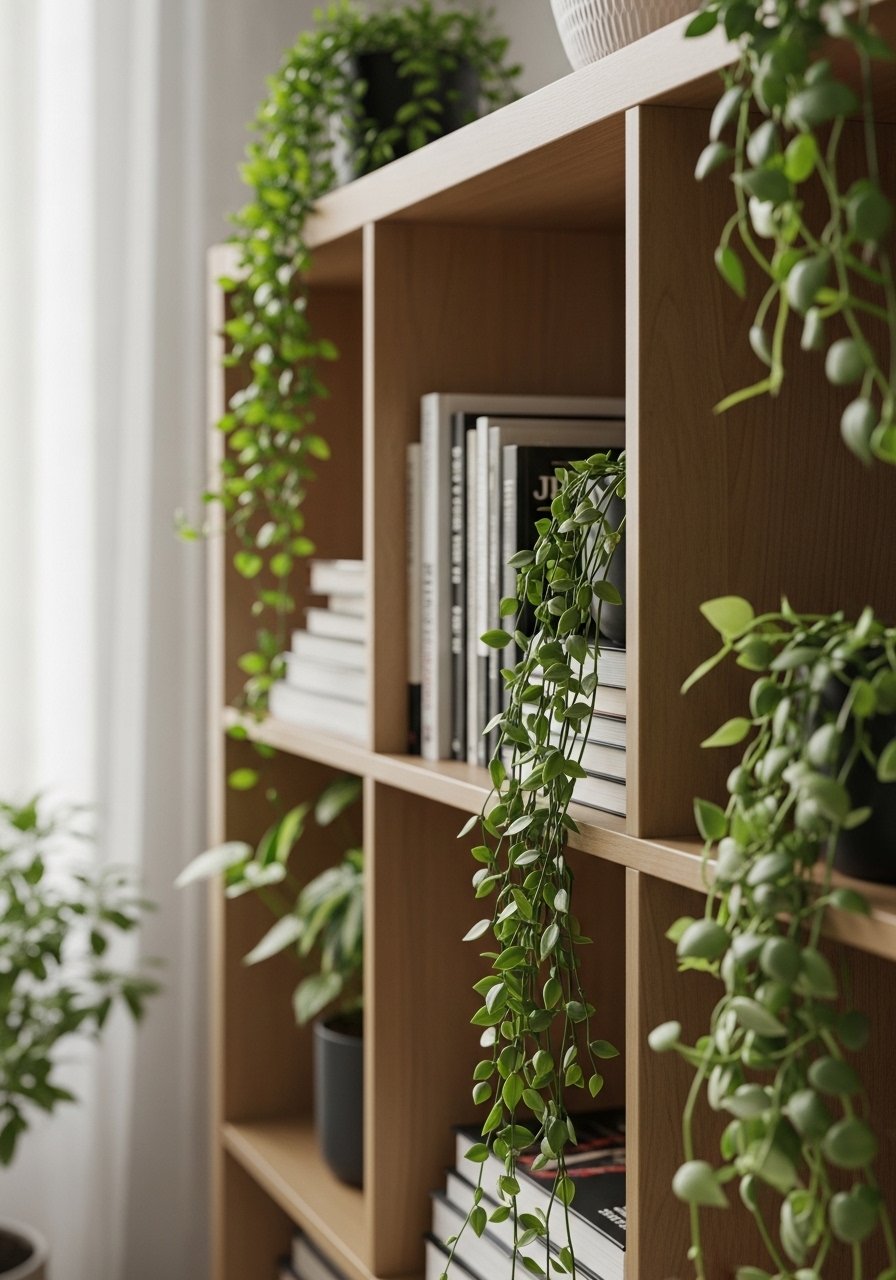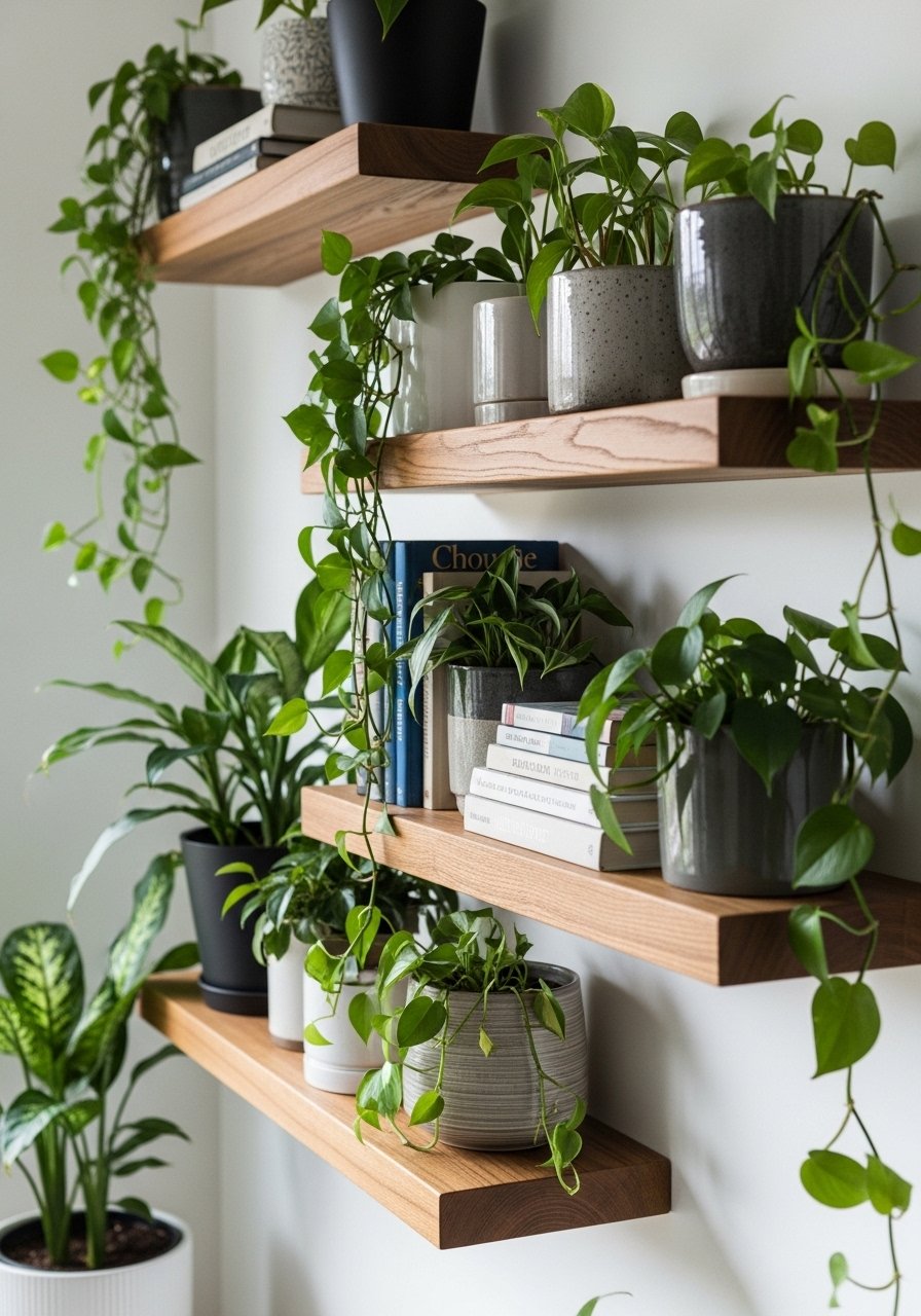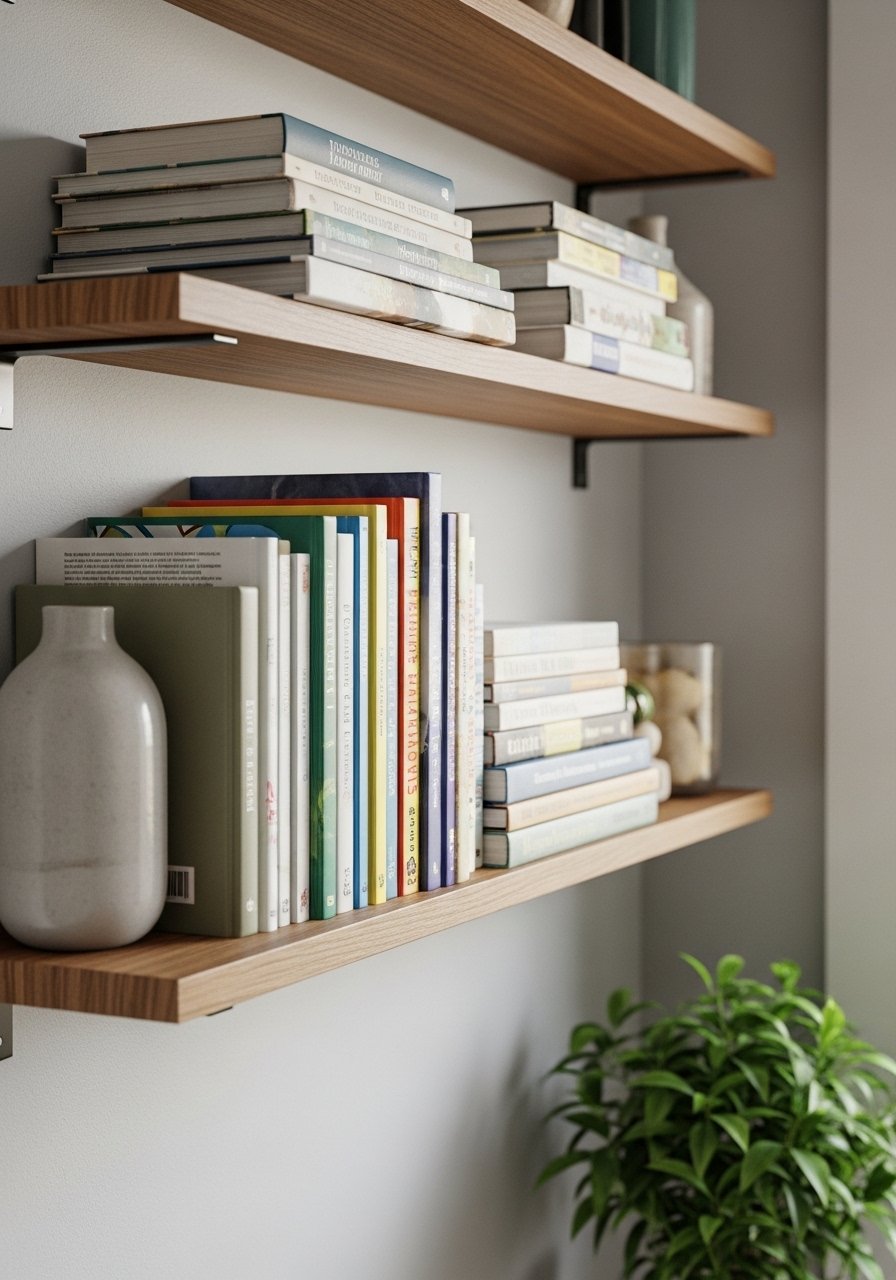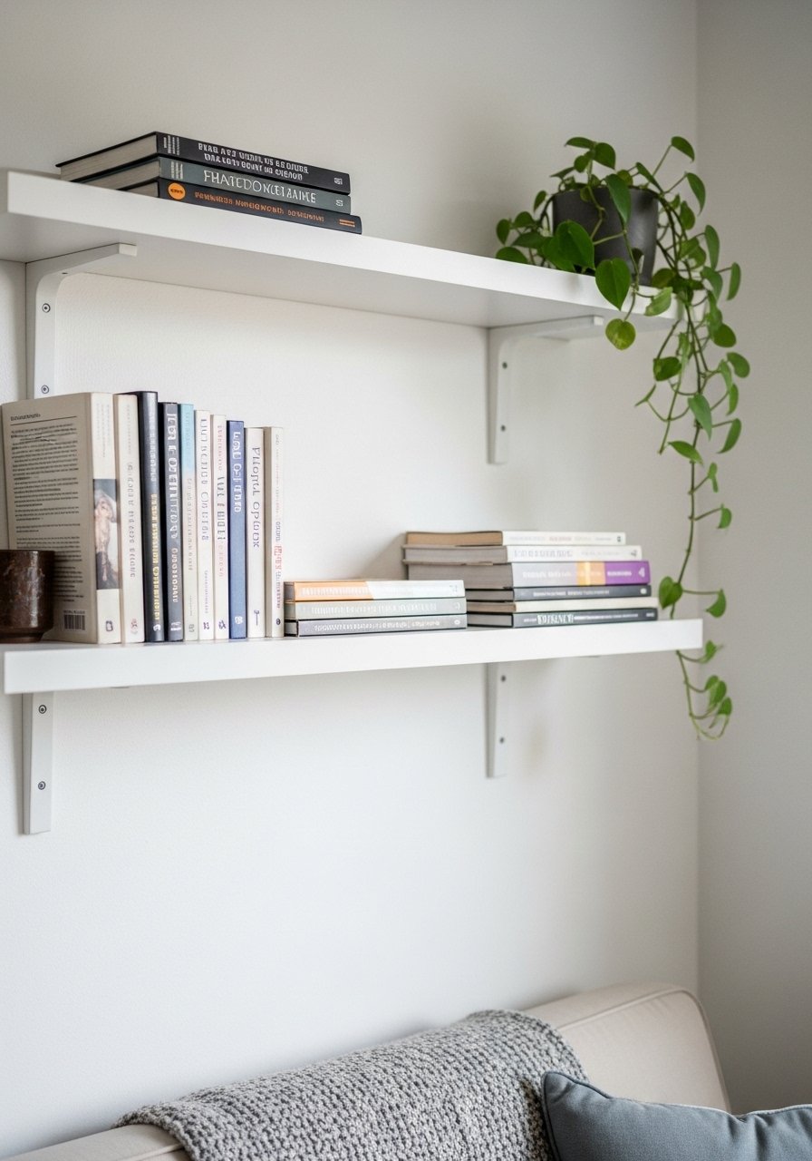 When floor space is tight, I look up. Floating shelves and a narrow bookshelf let me stack books and plants so the eye travels upward. Strategically placed plants soften the shelves and make the room feel curated, not cramped.