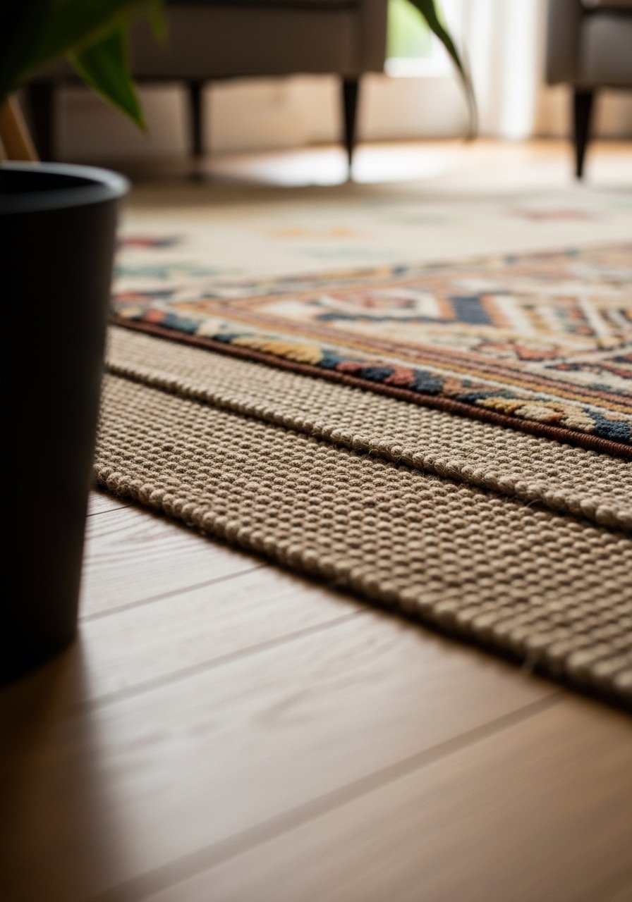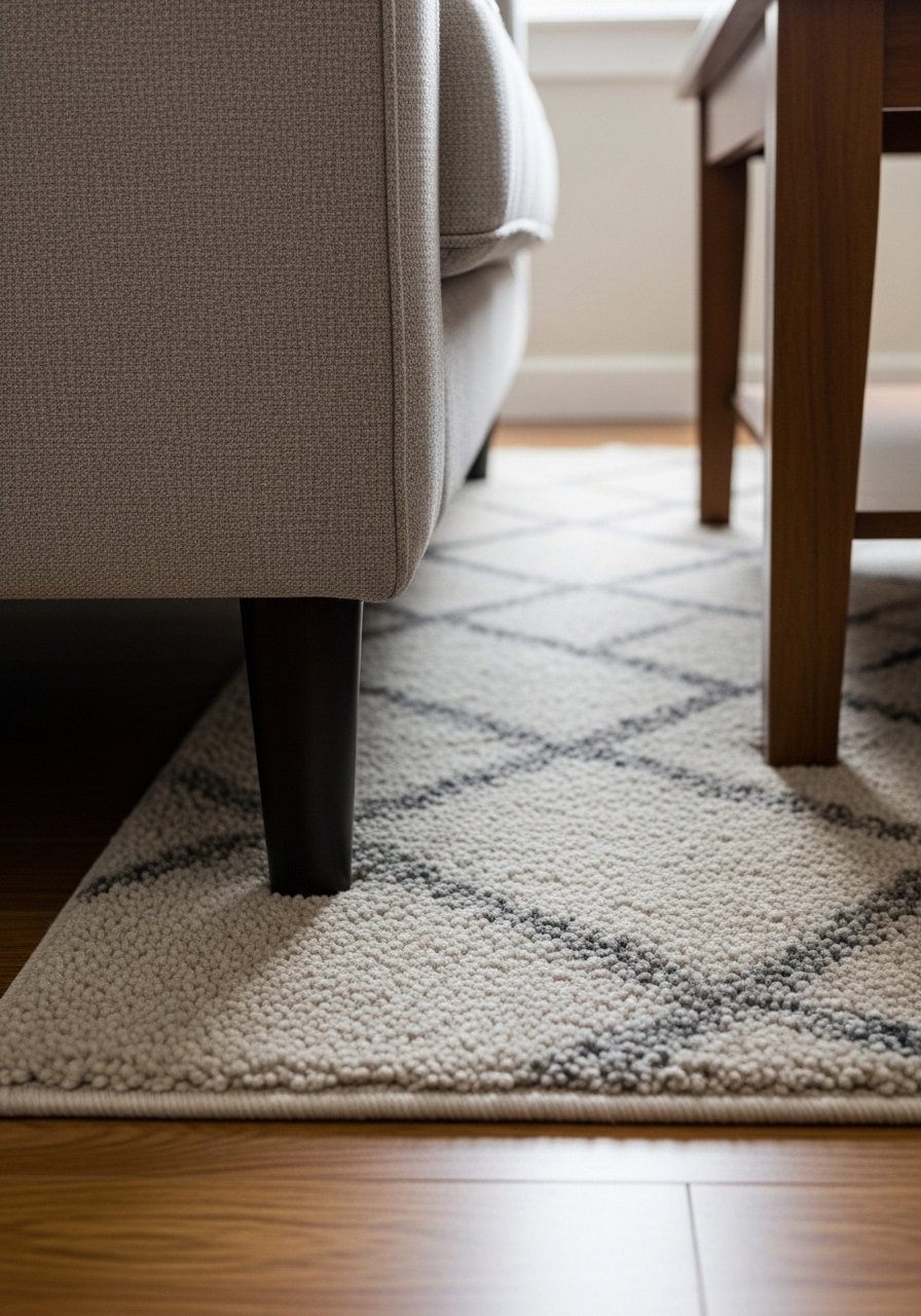 I pick a rug that fits the seating group—often just under the front legs. That tiny choice ties the furniture together without swallowing the floor. Layering a textured throw and a thin runner at the entry helps the eye move and keeps things cozy. People miss scale here: too-small rugs float without purpose. The error to avoid is a rug that becomes the only focal point; it should help the furniture read as a single, calm group.