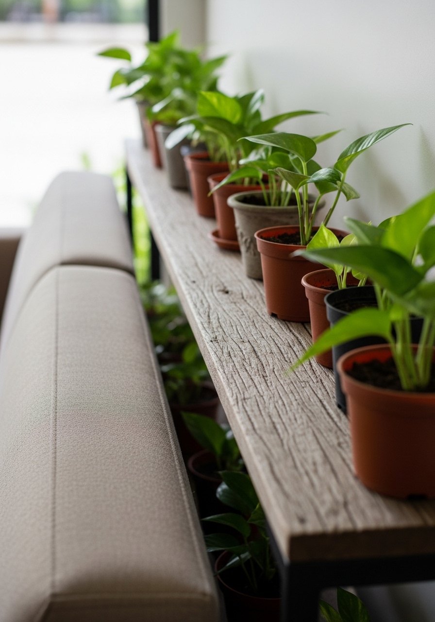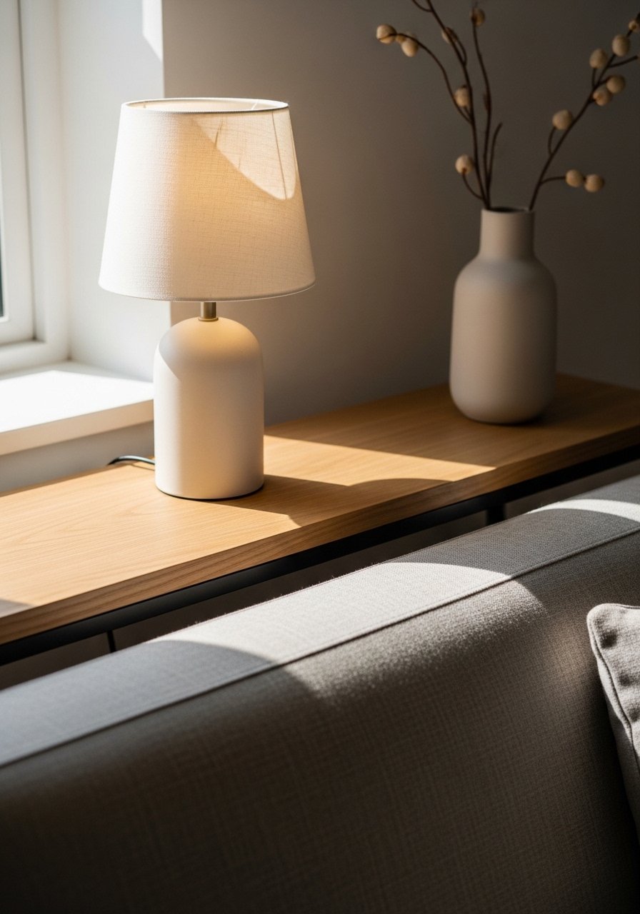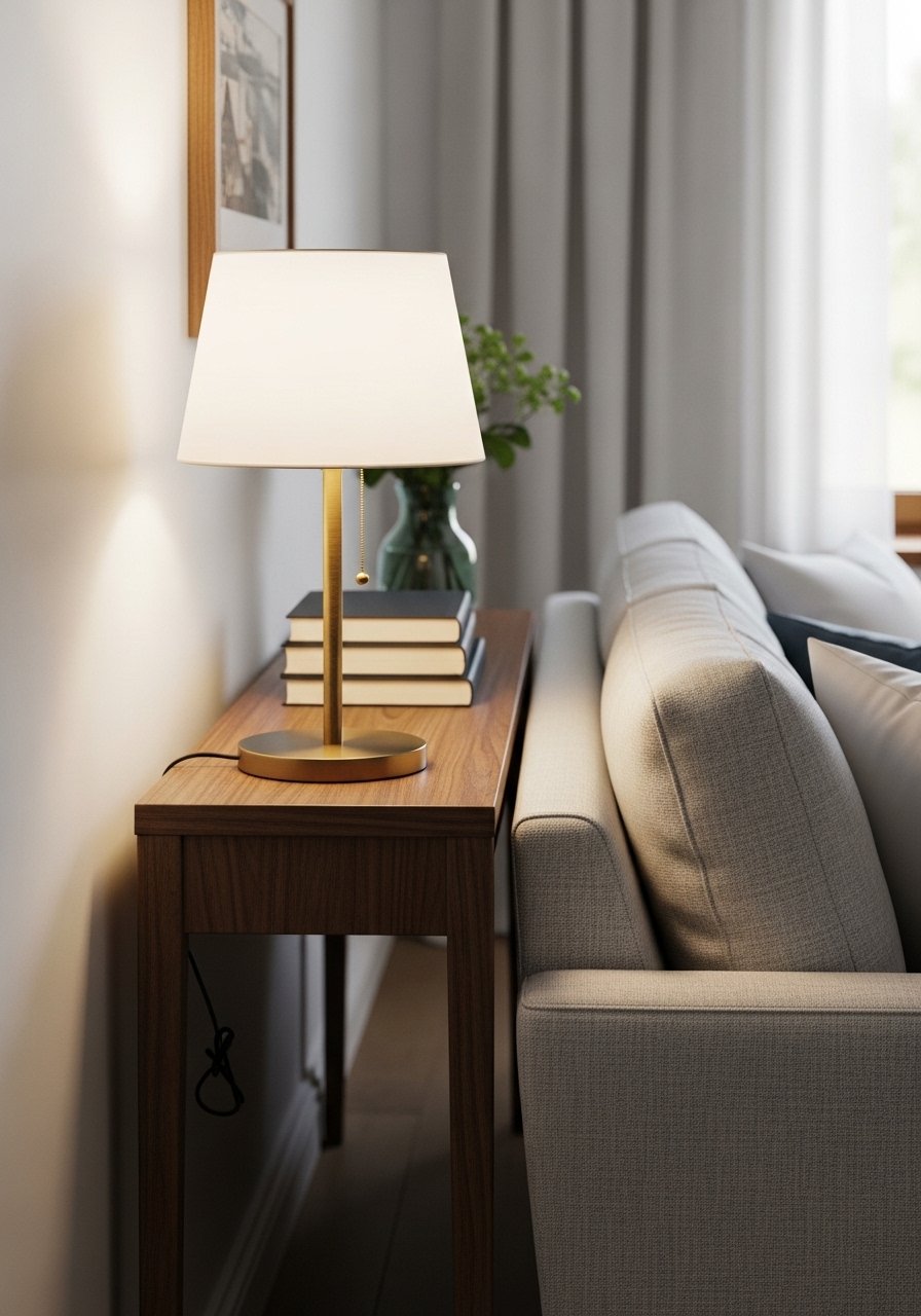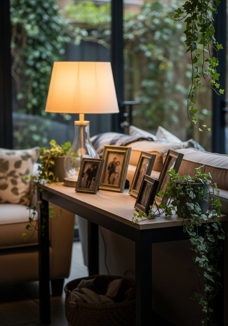 A slim console behind my sofa added surface space without a second seating footprint. I keep keys, a lamp, and a plant there.
