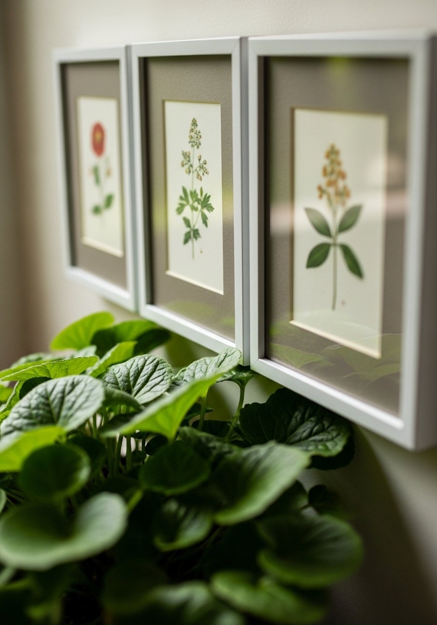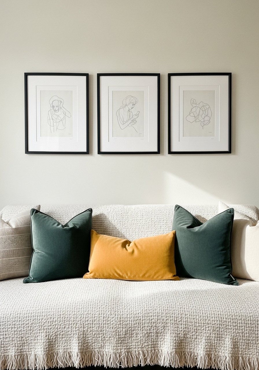 A tiny grouping of three prints above my couch gave the room personality without clutter. Simple frames keep it calm.