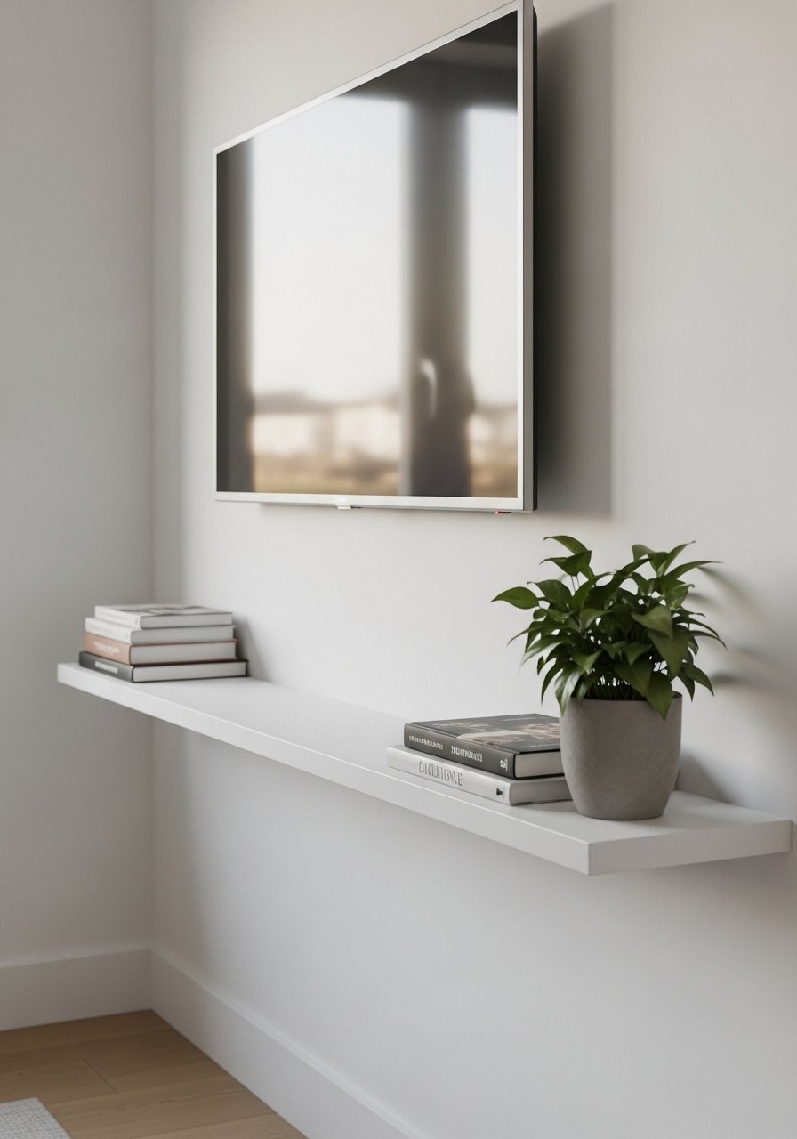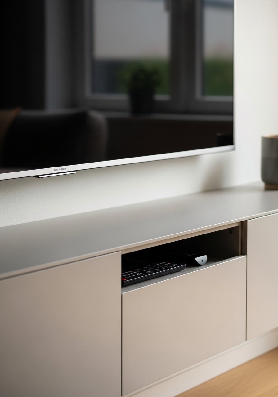 I mounted my TV and used a shallow media console beneath it. The vertical storage keeps remotes, games, and a plant without bulk.