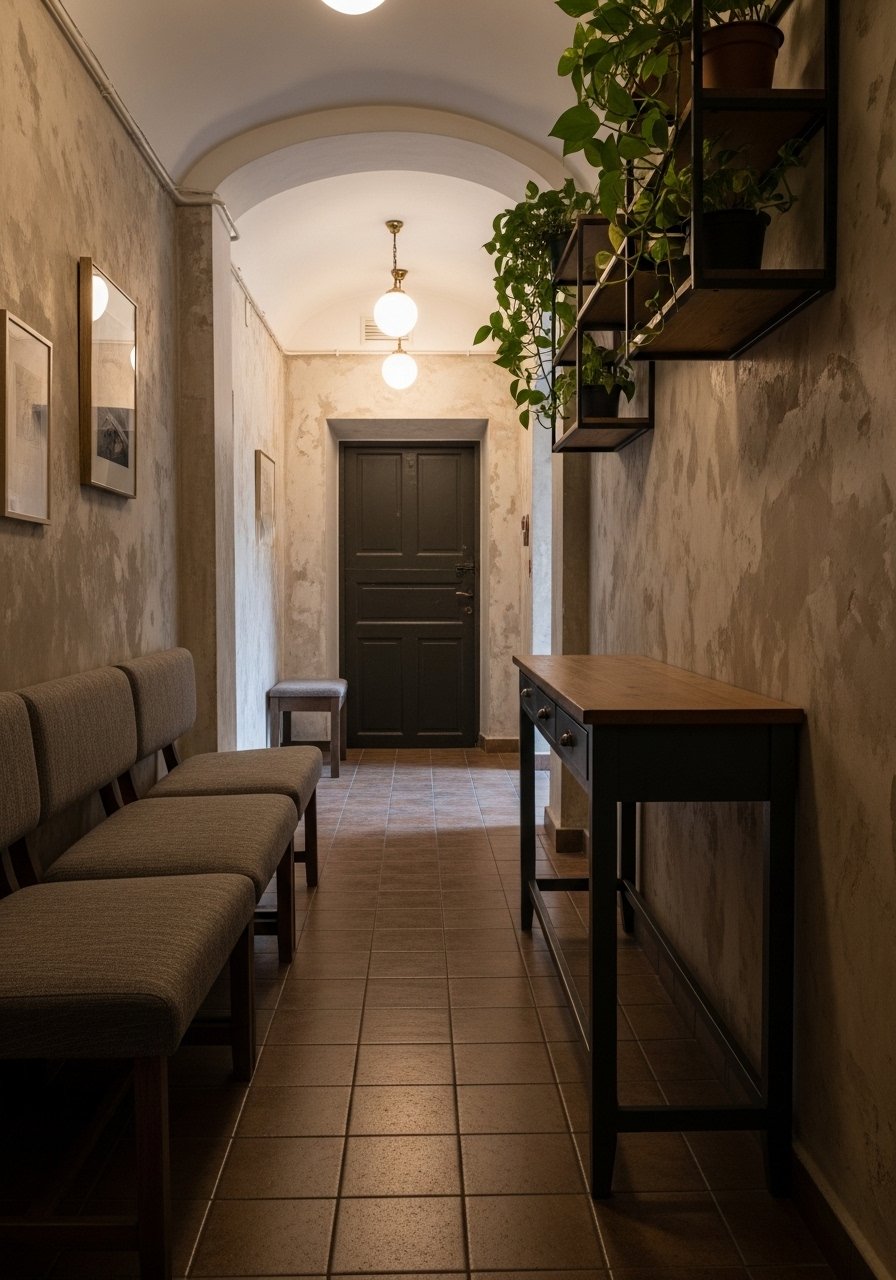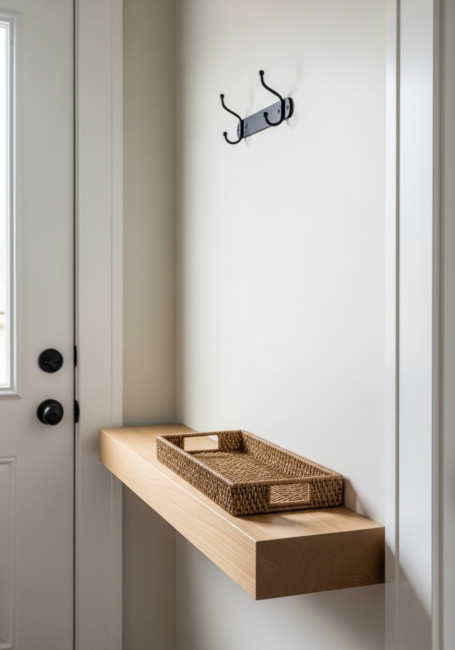 The visual change is immediate: clutter moves off the floor and becomes part of the composition. People often forget to vary heights and textures on the shelves. Avoid overfilling them — a few well-placed items look cleaner than a shelf crowded end to end.