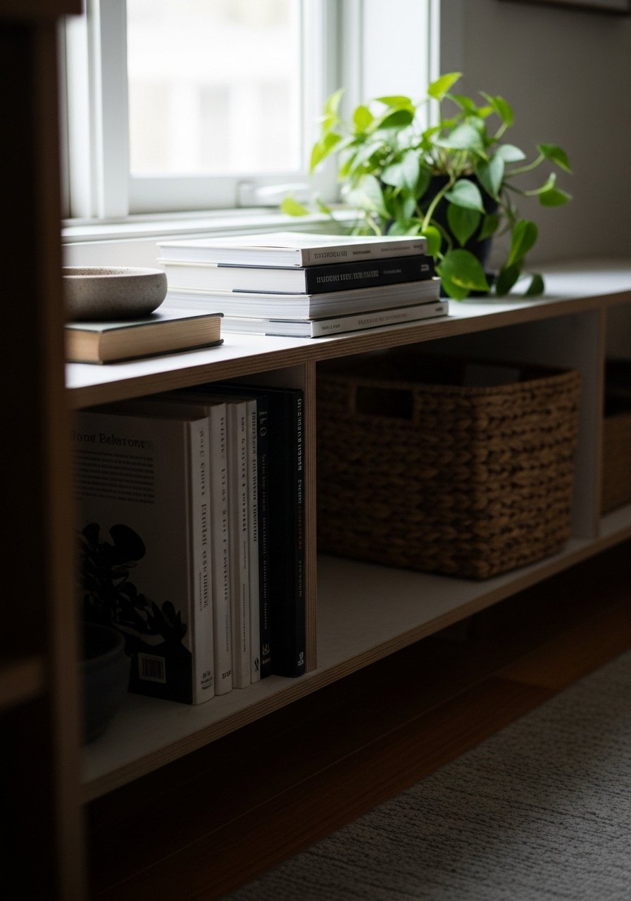 Editing is gardening in slow motion: I prune items I don’t use and rotate objects seasonally. A storage ottoman and a narrow bookshelf hide the parts you don’t want on display.