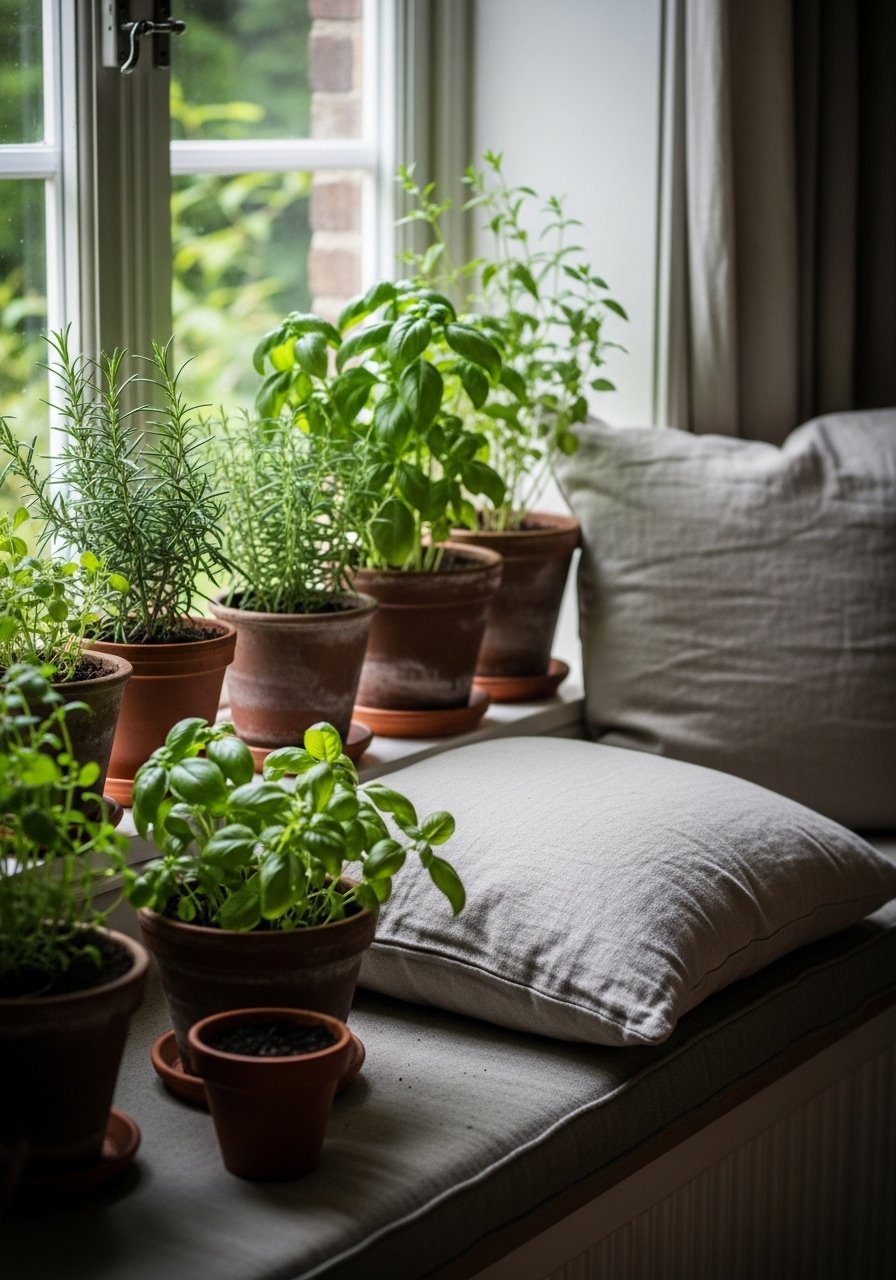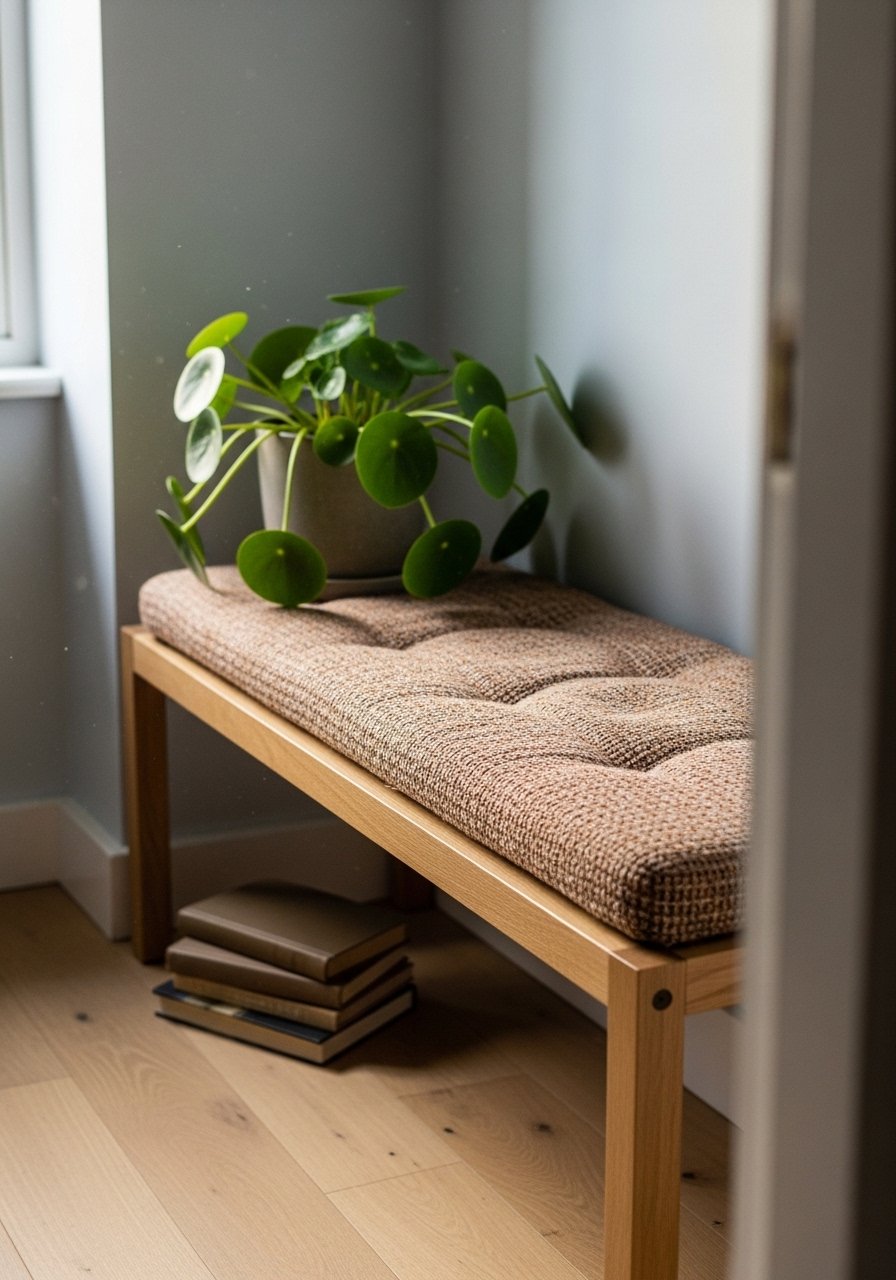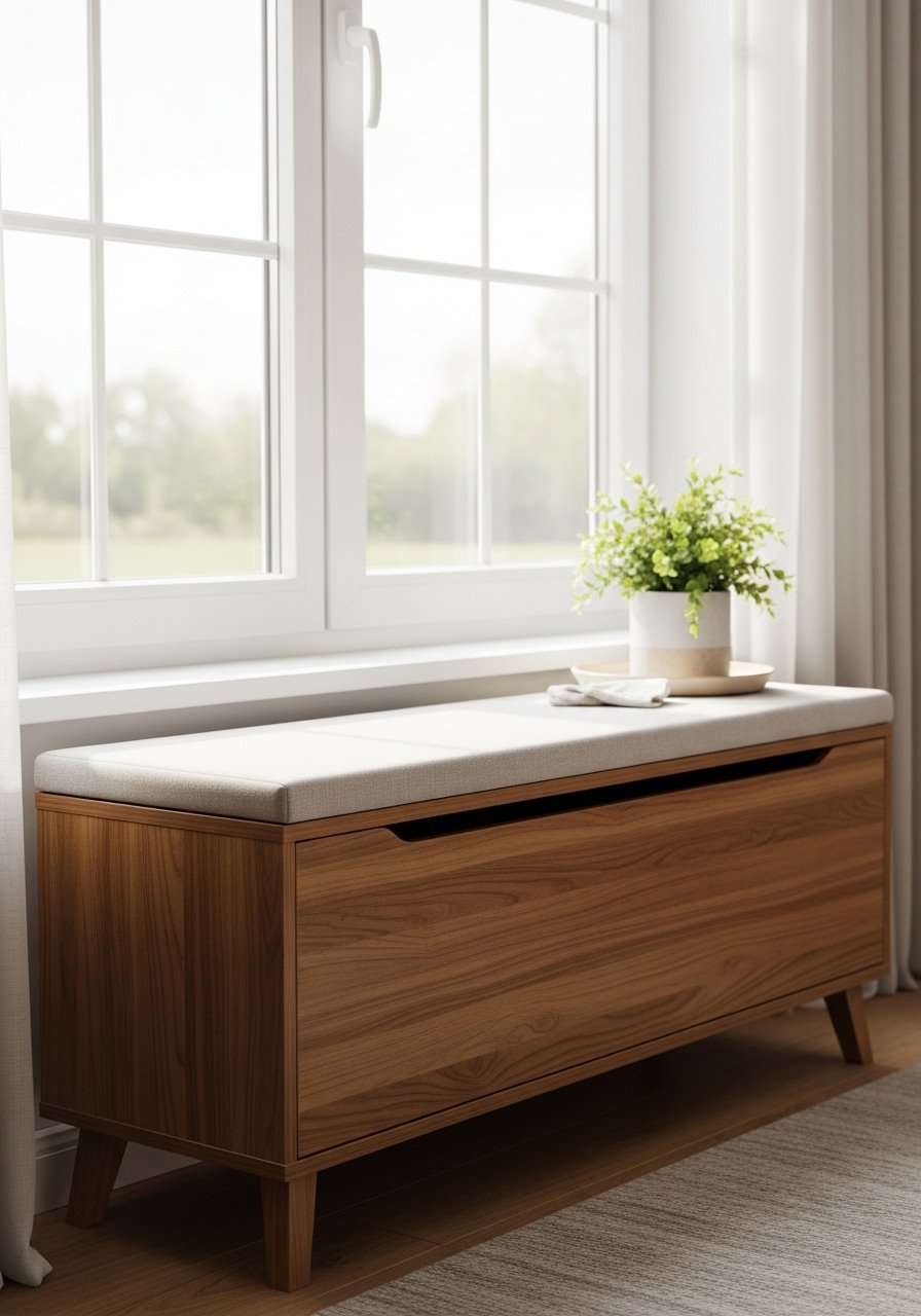 I placed a slim storage bench under the window for extra seating and hidden blankets. It reads tidy and doubles as display space for a plant.