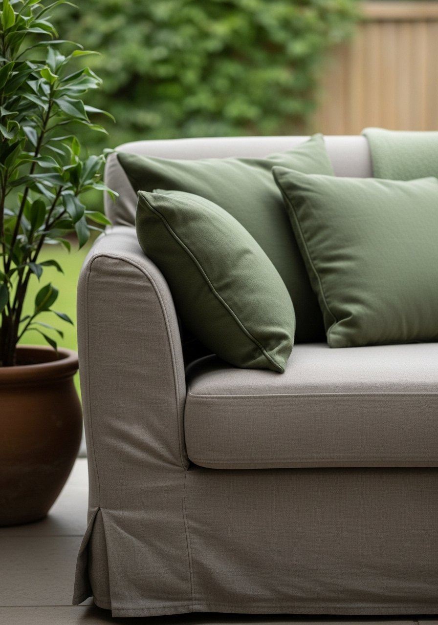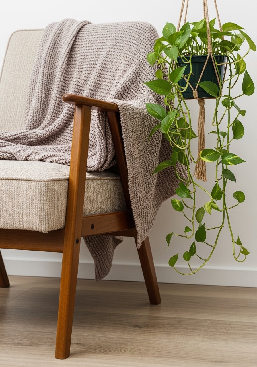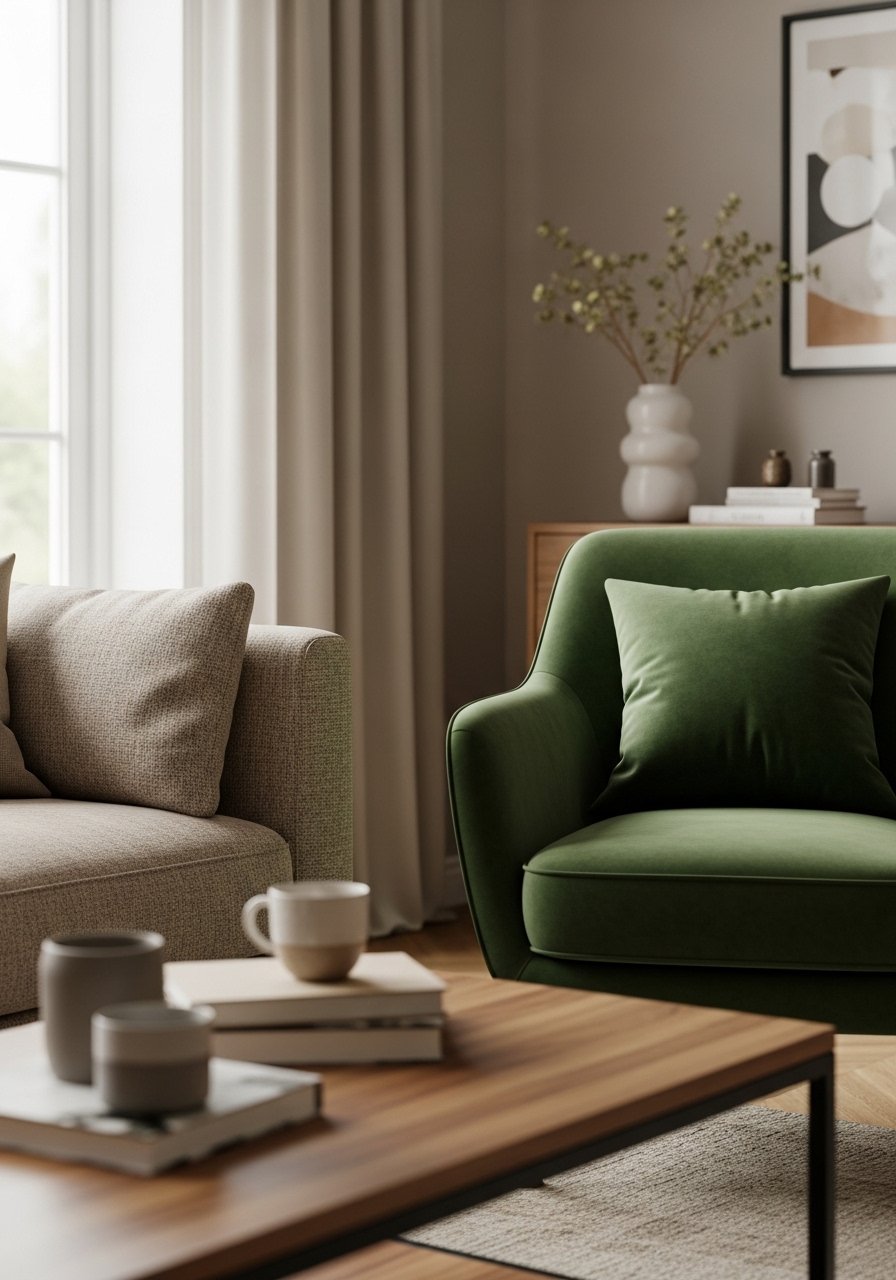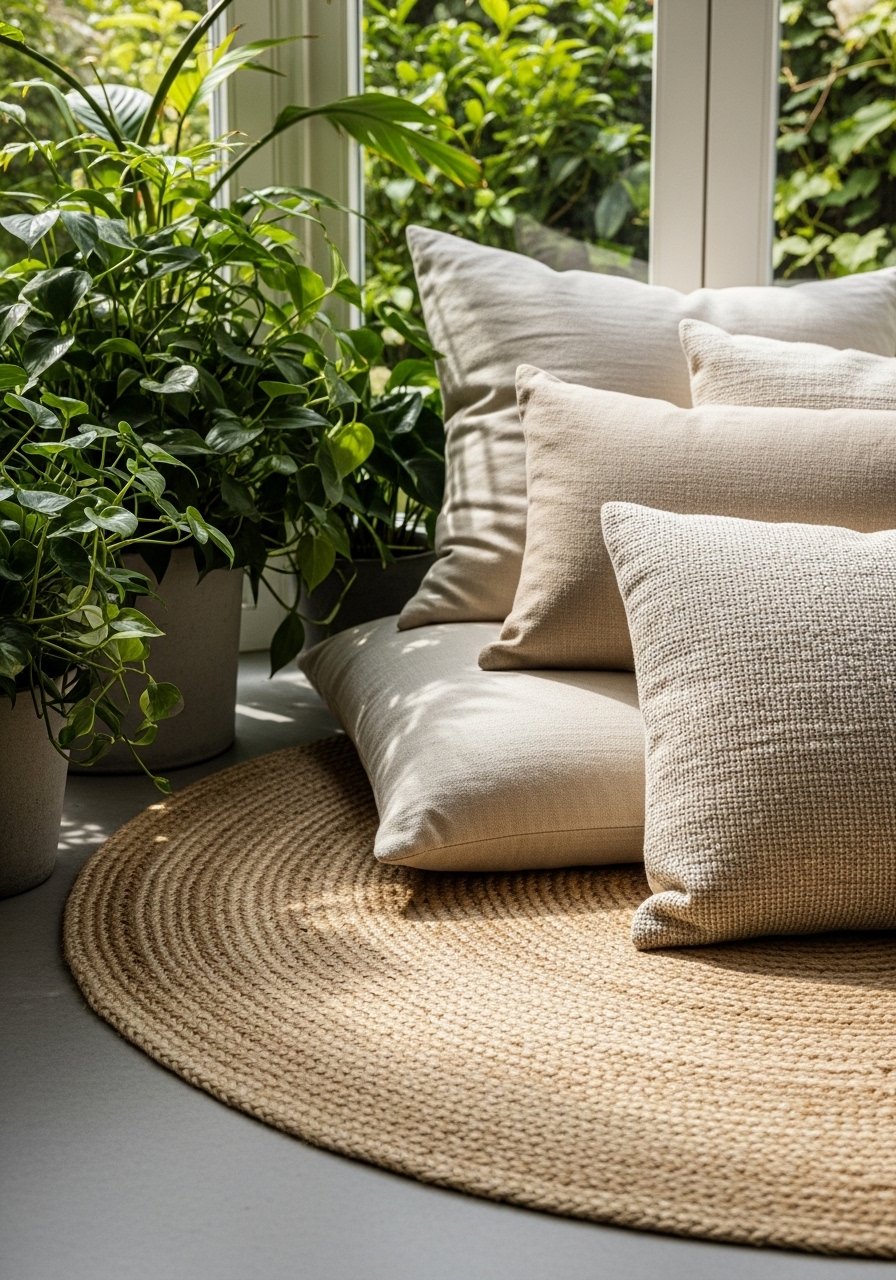 I finish by grounding the seating with a modest rug, two matching pillows, and one curated group of plants. The rug ties the pieces into a clear zone. A consistent palette — two neutrals plus one accent — keeps things calm.