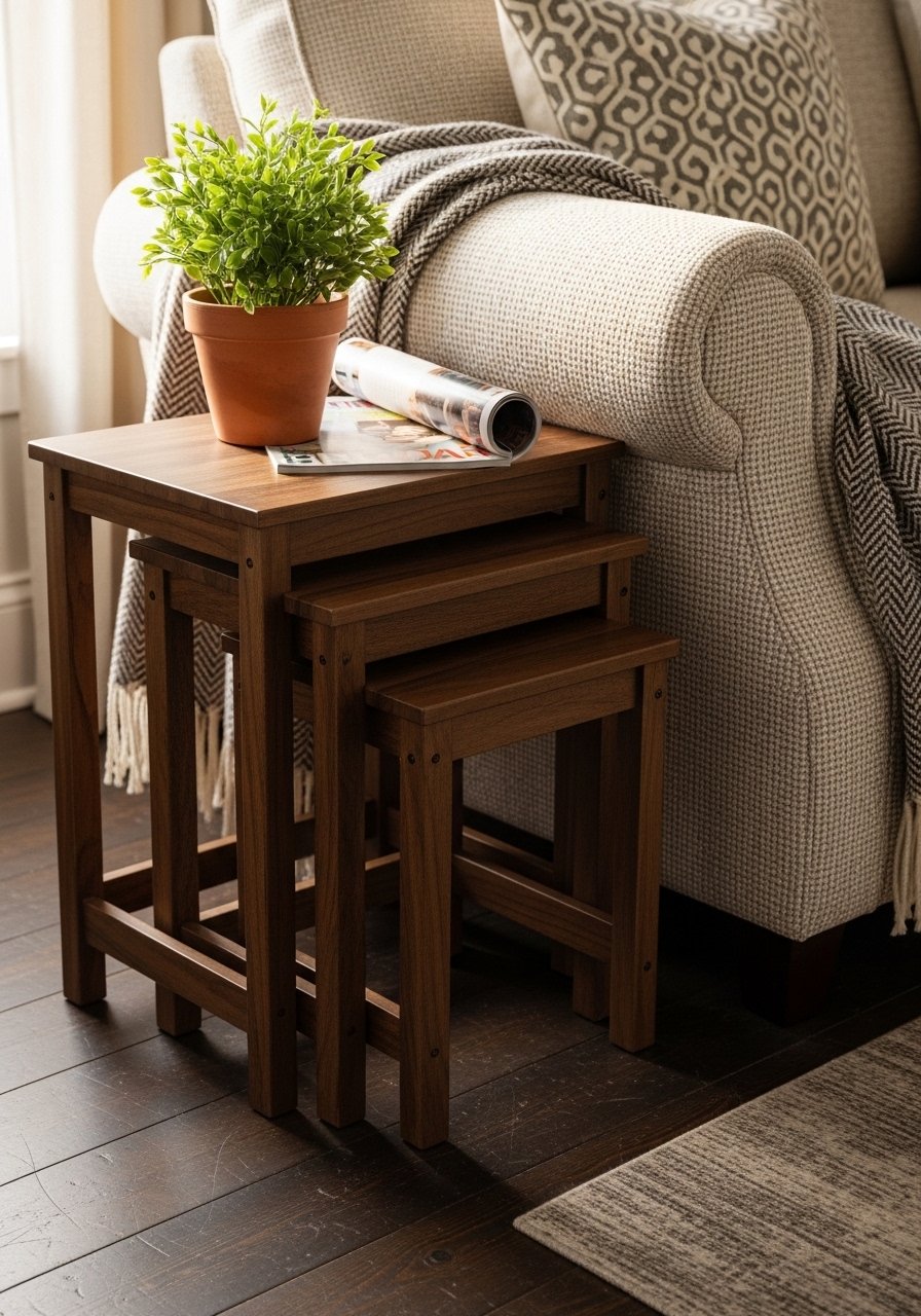 I keep a set of nesting tables by the sofa. They slide together when I need space and spread out when guests arrive.
