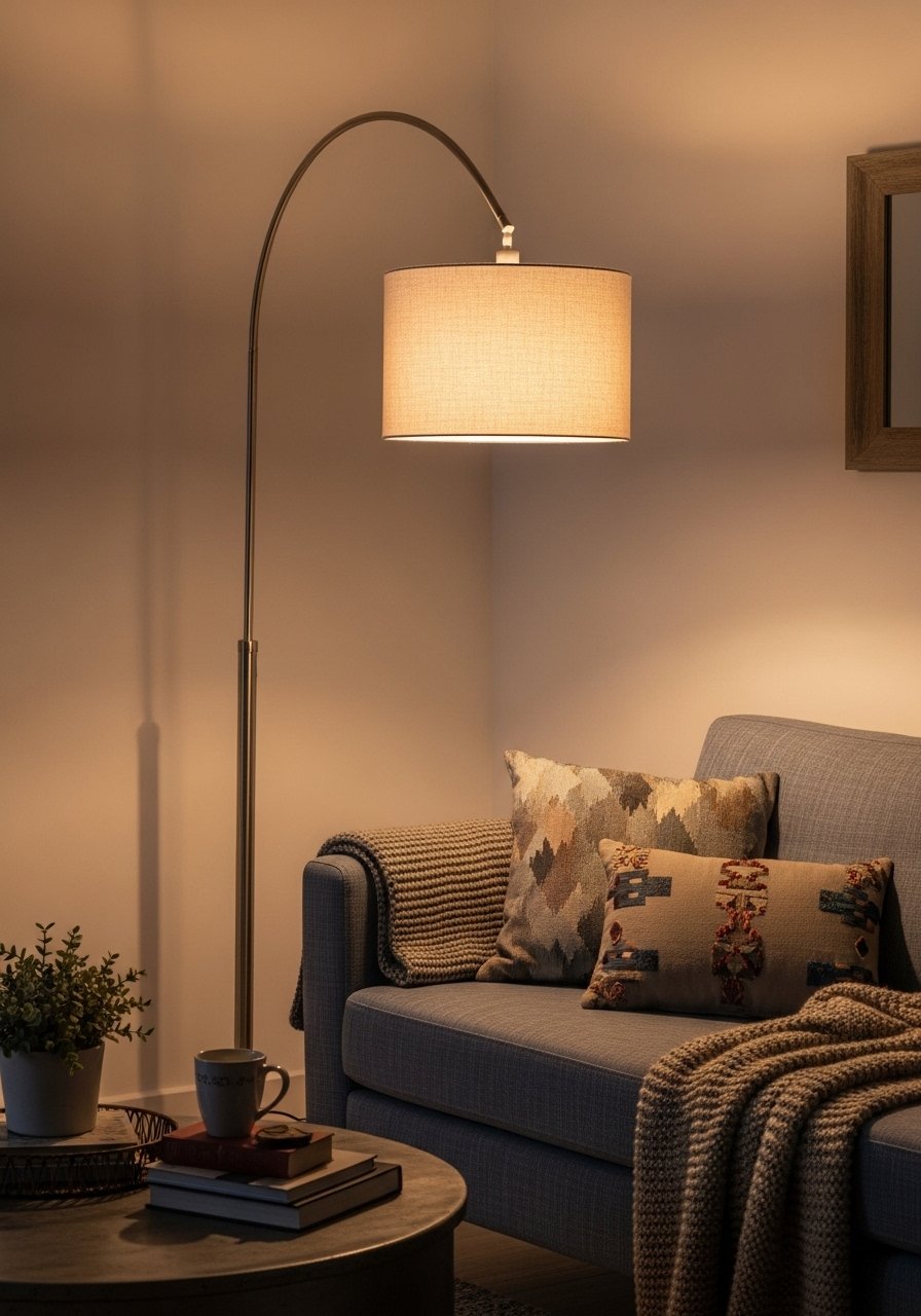 I swapped two table lamps for one arched floor lamp. It clears the surfaces and softens the whole room.