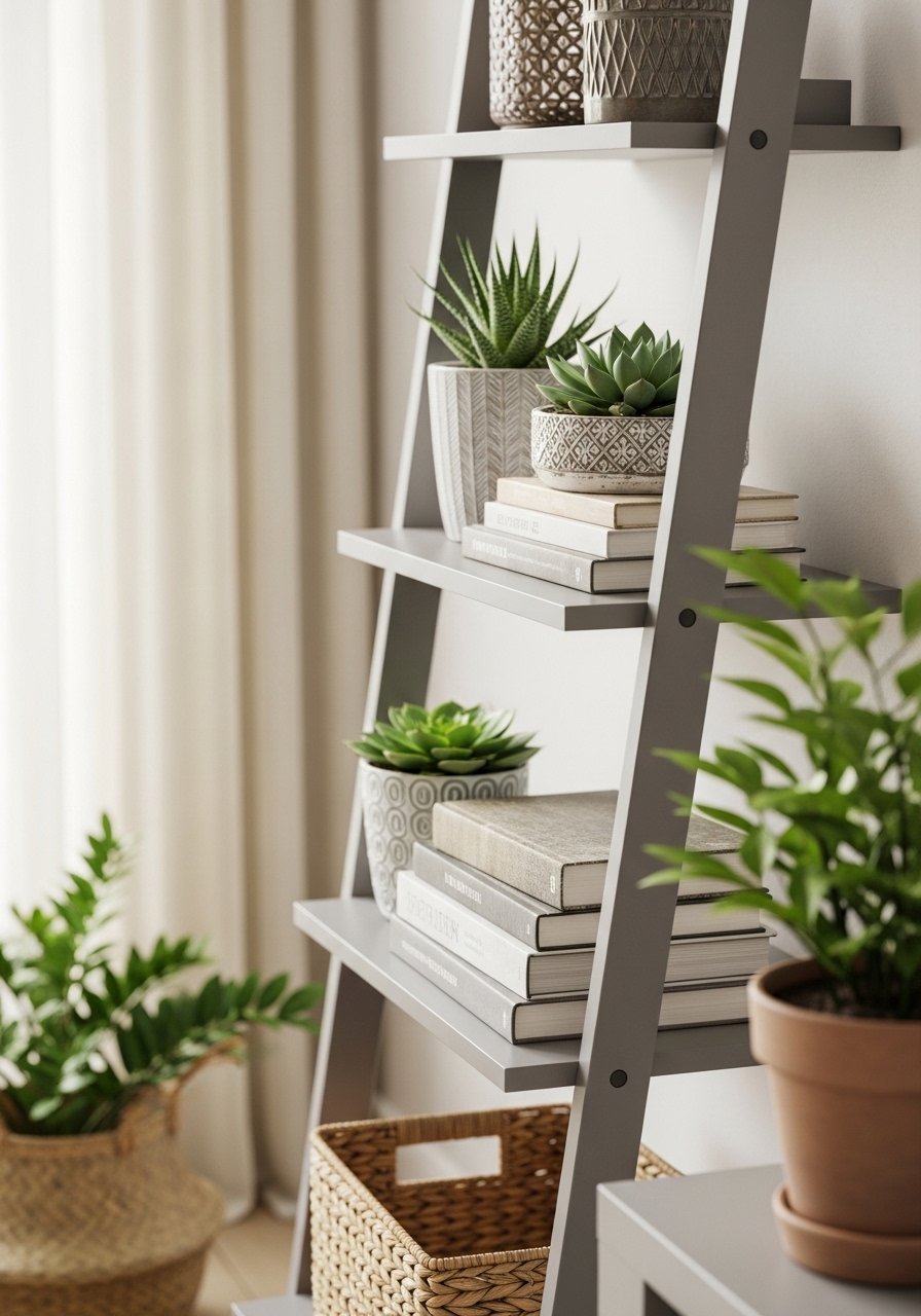 I leaned a narrow ladder shelf in a window corner. It holds plants and a few books without stealing floor space.